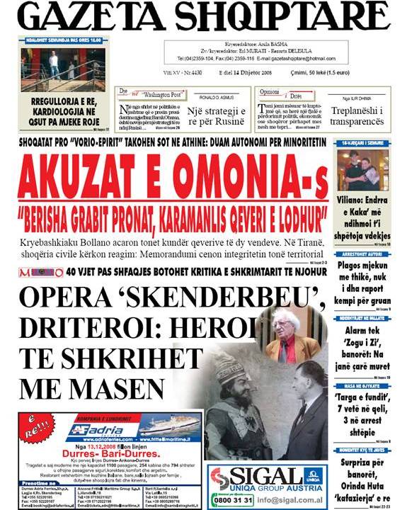 Δείτε το χθεσινό πρωτοσέλιδο της Gazeta Shqiptare
