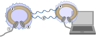 4) Electricity picked up by laptop's antenna, which must also be resonating at 10MHz. Energy used to re-charge device