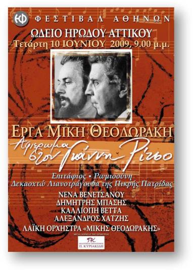 Στις 10 Ιουνίου 2009 στο Ωδείο Ηρώδου του Αττικού, η Λαϊκή Ορχήστρα «Μίκης Θοεδωράκης, θα αποδώσει τις τρεις κορυφαίες δημιουργίες αυτής της συνεργασίας, τον «Επιτάφιο» (Αθήνα 1960), τη «Ρωμιοσύνη» (Αθήνα 1966) και τα «18 Λιανοτράγουδα της Πικρής Πατρίδας» (Παρίσι 1973). Ο Δημήτρης Μπάσης, η Νένα Βενετσάνου, η Καλλιόπη Βέττα και ο Αλέξανδρος Χατζής θα είναι οι ερμηνευτές της μουσικής αυτής βραδιάς. Θα ακουστούν γνωστά τραγούδια μεταξύ των οποίων «Είσουν καλός», «Νάχα τ’ αθάνατο νερό» από τον «Επιτάφιο», «Όταν σφίγγουν το χέρι», «Θα σημάνουν οι καμπάνες» από τη «Ρωμιοσύνη», και από τα «18 Λιανοτράγουδα της Πικρής Πατρίδας» το «Μνημόσυνο», το «Κυκλάμινο», «Εδώ το φως», καθώς και πολλά άλλα, χαρίζοντάς μας στιγμές νοσταλγίας, ευφορίας και ψυχικής ανάτασης.